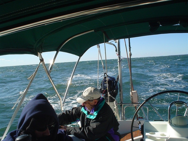 Yep, proof that I was there. SOG 7.3Kn, COG 201°M, TWS 18.2Kn, TWD 087°M - From ship's log at 1000; Full jib, reefed main. Pretty morning, but stuffy cabin with hatches & most portlights closed. Running MG set to charge batteries. |