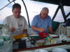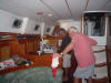 Early dinner. Chef 1st Class Al slicing meatloaf. SOG 4.8Kn, COG 184°M, TWS 9.3Kn, TWD 049°M - On this leg we decided to have dinner in mid-afternoon so that all could partake at one sitting.