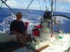 In-flight refueling. Motoring slowly. SOG 3.8Kn, COG 179°M, TWS 9.0Kn, TWD 047°M - From ship's log at 0758; Finished refuel w 15 gals. Al strapped in on swim platform, assisted by Glen & John holding lashings to each jug with me as go-for & cleanup guy. Gage = 3/4 now. |